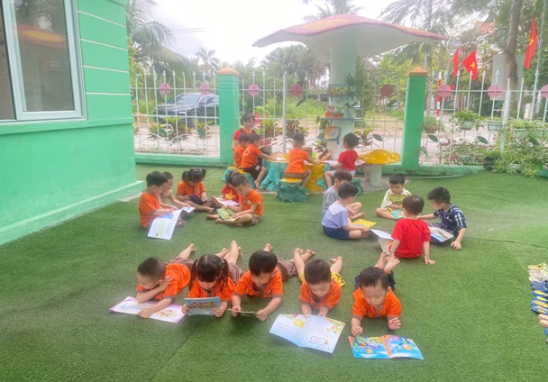 Sách truyện là món quà tinh thần, đặc biệt thu hút các em nhỏ. Sau những giờ học mệt mỏi, đây là thiên đường cho óc sáng tạo, xua tan căng thẳng. Không chỉ đọc sách, làm quen với sách mà ở góc sách của nhà trường, các cô giáo còn chuẩn bị rất nhiều các học liệu như: bút chì, bút màu, keo dán, kéo, giấy trắng, bìa màu, tạp chí cũ, giấy màu...để cô và các bé cùng nhau sáng tạo, xuất bản ra những quyển sách “ vải ” của cô và trò. Những quyển sách này được cô và các bé làm theo từng chủ đề hoặc tuỳ vào cuộc trò chuyện của cô và trẻ, một cuốn sách sẽ ra đời theo trí tưởng tượng phong phú của trẻ về những điều trẻ mơ ước. Được bắt tay vào làm cùng cô, trẻ hiểu sự vất vả để làm ra một quyển sách và từ đó trẻ càng thêm yêu quý và giữ gìn sách truyện hơn.