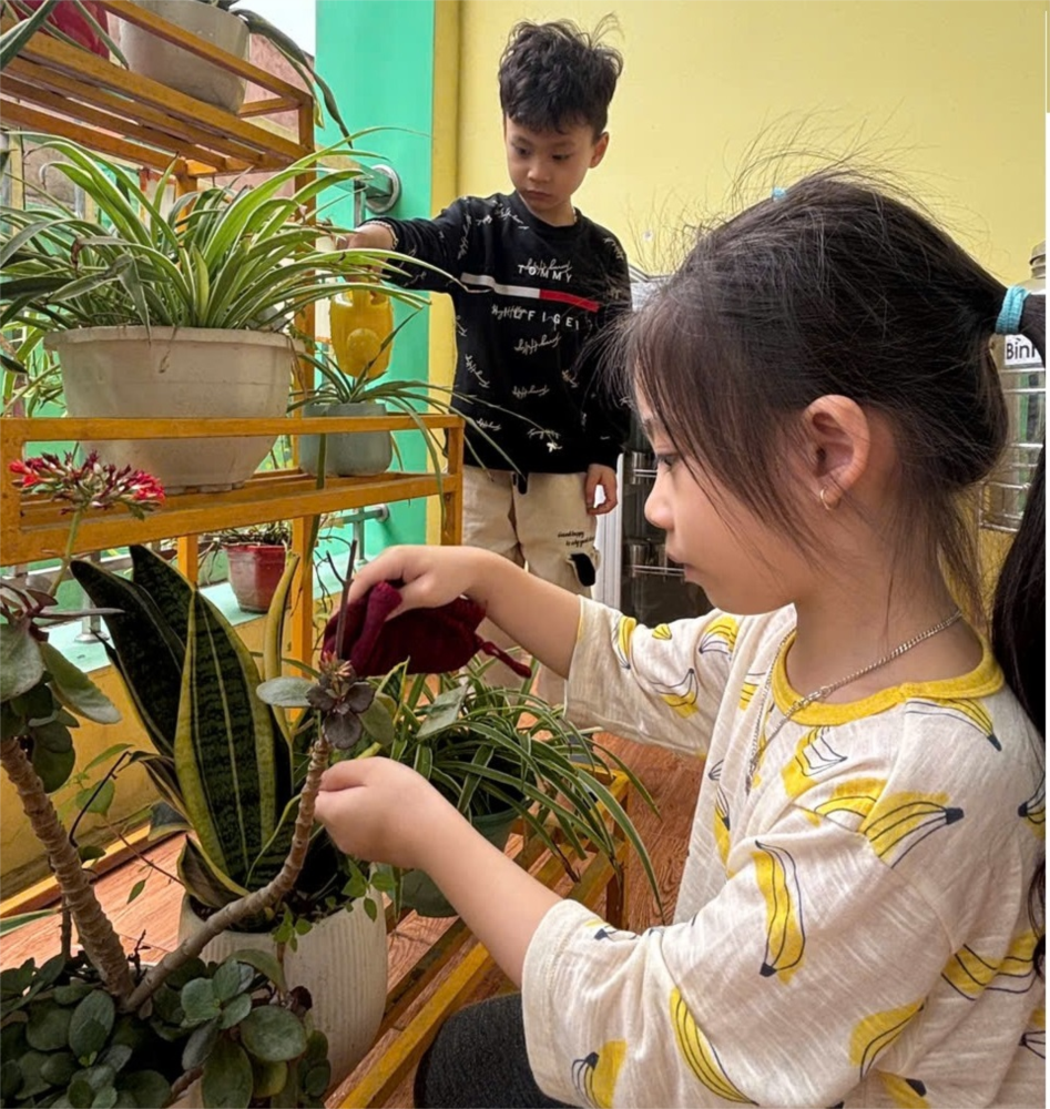 bé lớp 5A3 đang làm gì không? Các bé đang lau lá cây, tưới nước và chăm sóc cây