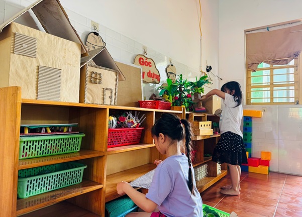 hình ảnh của các bé lớp 5A2 trường mầm non Thành Tô vệ sinh các góc chơi.